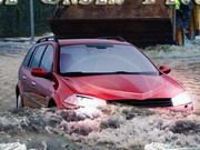 Heavy rain has swollen the rivers and caused floods in the fields on the sides of the road. Everything is soaking wet and cars barely maneuver on the slippery road.Drive through puddles and over wet asphalt in this water racing game.